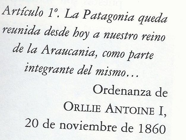 “En el año 1860 concebí la idea de que podía civilizarse a los indígenas eligiéndome su jefe, ya sea tomando el nombre de rey o cualquier otro que significara una autoridad suprema en un estado, y al efecto me dirigí a la Provincia de Valdivia o sur de Araucania y allí tuve ocasión de entenderme con varios caciques y hacerles conocer mi propósito; mas como estos me aceptaran con agrado y reconociera yo que el dictado de rey era el más conocido y acatado entre ellos, tomé ese título”.